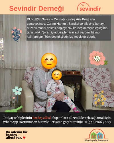 Özlem Hanım'a Kira DesteğiÖzlem Hanım'ın eşi terk etmiş. 1 yaşında kızı var. Kendisi kanser tedavisi görmüş ve çalışamaz durumda. Ev sahibi tahliye davası açmış. Kendi ayaklarının üzerinde duracak hale gelene kadar 12 aylık kira desteği sağlayacağız.