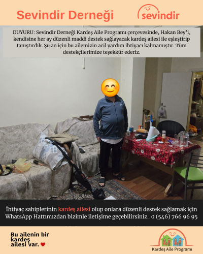 MS Hastası Hakan Bey'e Barınma DesteğiHakan Bey MS hastası, servikal disk bozuklukları, işitme kaybı, multipl skleroz, diyabet ve hipertansiyon rahatsızlıkları var. Engelli raporu bulunuyor. Ancak engelli maaşı kirasının belli bir kısmını karşılamakta. Eşi terk etmiş ve liseye giden bir oğluyla birlikte yaşıyor. 12 aylık kira desteği sağlamayı taahhüt ettik.
